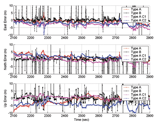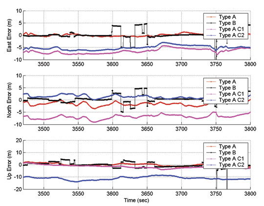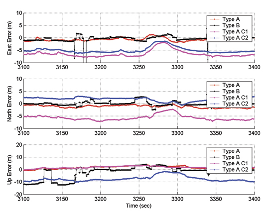 Figure 8 illustrates a time series of the positioning error components of all four receivers. It clearly shows error ramp-ups from the Type B receiver at frequent intervals. These coincide with the satellite count drops of Type B shown in Figure 6. No such error ramp-ups are observed for any of the Type A receivers, although relatively large biases of the order of few meters can be seen. As anticipated, larger errors are observed in the height direction.