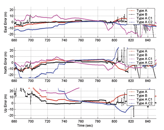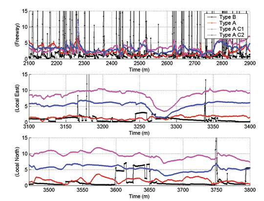Figure 5 shows a plot of the 2D position error observed from each receiver during the test as a function of driving environment. Overall, Type B receiver shows better accuracy as expected from a dual frequency high quality receiver. However, it shows spikes of large error increases at times, mostly observed in the freeway scenario with large error excursions. With Type A receivers, relatively larger errors are observed with the limited-constellation receivers.