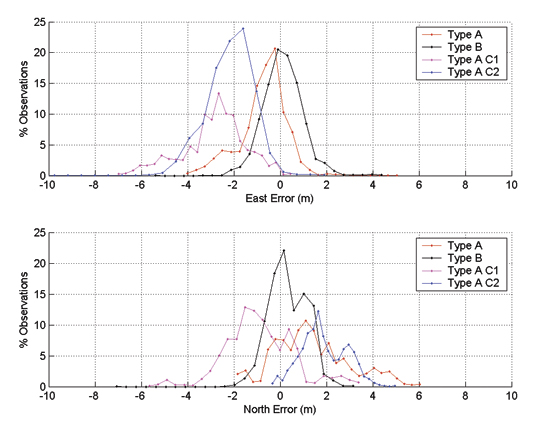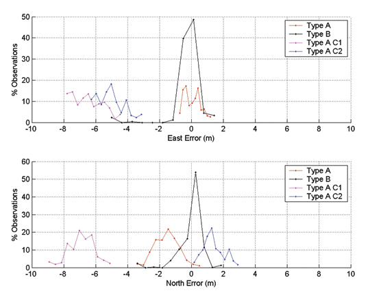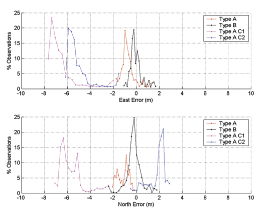 Figure 12 shows the time series view of the positioning error in this segment, confirming that the biases observed in Figure 11 are not short-term biases, but are in fact vehicle heading-dependent biases. The short-term biases seen in the Type B receiver output coincide with the change in the number of satellites used (shown in Figure 6). This illustrates the implications of different estimation methods used in the two receiver types. For instance, Type B receiver allows stepwise changes in its position estimate whereas Type A output tends to gradually converge to different states.
