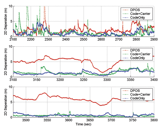 For a limited dataset, additional measurement-level differential processing was done to show the difference between a DPOS and an RTK or a code-based differential relative position solution.