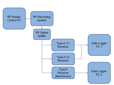 Figure 4 shows an example RF data replay setup. The record and replay system was controlled through a PC and the recorded data was also stored in the controller PC. The output RF signal was split into multiple outputs such that multiple receivers can be tested at the same time. For each replay of the RF data, a benchmark receiver was also used to verify that there is no run-to-run difference as a result of the RF replay.