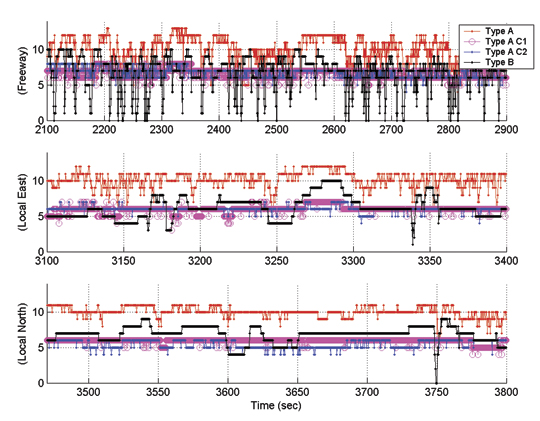 Freeway Data. The vehicle heading in this segment was predominantly north or northwest. The sky view can be considered a combination of urban and open sky conditions. As highlighted in Figure 6, all-in-view Type A receiver was able to use up to 11 GPS satellites with an average of around 9 satellites. Type A C1 and C2 receivers used, on average, about 3 satellites fewer than the all-in-view receiver. All three receivers show satellite count drops down to 4 at certain times in this segment.