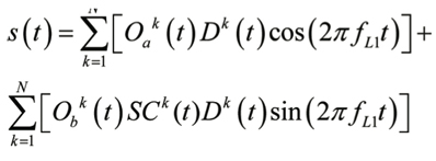 where Oak and Obk are the publicly known spreading codes such as the C/A and P-code of GPS for every K satellite, SCk is the is the stream cipher (W code for GPS) and Dk is the transmitted data. After the AD conversion the signal will be: