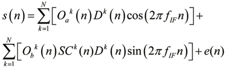 After the carrier removal by multiplication with sin (2π fIFn) to obtain the quadrature arm containing the encrypted signal, and after the application of a low-pass filter to cut the 2π (2 fIF) frequency, the remaining signal for every satellite is: