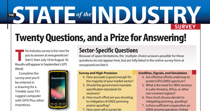 The 2013 State of the GNSS Industry Survey is going on now at env-gpsworld-integration.kinsta.cloud/State13, until August 10. The survey covers economic outlook, technological frontiers, industry concerns including “The Issue of the Year,” and several questions specific to vertical industry sectors. All those completing the survey will be entered into a drawing to win the Trimble Juno T41.
