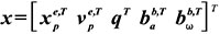 In the GPS/IMU integration algorithms, the navigation equations of the body frame (b-frame) are expressed in an e-frame. Therefore, the full state vector x includes the position xep and the velocity vep, represented in the e-frame. For the attitude representation a quaternion q is used. Finally, the accelerometer bias bba and the gyro bias bbω are also estimated: