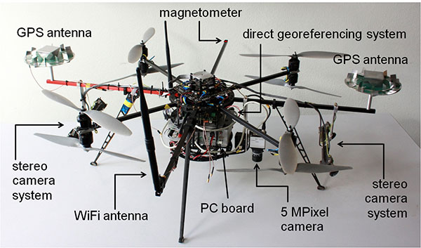 Mapping on demand. The goal of this research project, funded by the Deutsche Forschungsgemeinschaft (DFG), is to develop an MAV that can identify and measure inaccessible three-dimensional objects by use of visual information. A major challenge within this project comes with the term “on demand.” This means that apart from the classical mapping part, where 3D information is extracted from aerial images, the MAV is intended to fly fully autonomously on the basis of a high-level user inquiry. During the flight, obstacles must be detected and avoided. To extract semantic information that can be used to refine the trajectory planning, the mapping data has to be processed in real time. When the georeferencing information is used as initial values for the bundle adjustment, the image processing can be significantly accelerated.