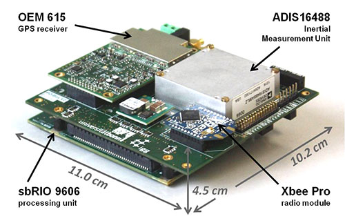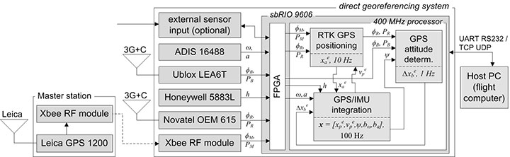 The direct georeferencing system further consists of a processing unit, which is a reconfigurable IO board, including a field programmable gate array (FPGA) and a 400-MHz processor. In this combination, the FPGA is used for fast parallel communication with the sensors. Afterwards, the preprocessed sensor data are provided to the 400-MHz processor via direct memory accesses, avoiding delays and supporting the system’s real-time capabilities. Finally, the actual position and attitude determination is carried out on the 400-MHz processor.