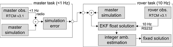 The observations of the master receiver must be transmitted via radio to the direct georeferencing system. In practice, this data transmission can only be realized with a rate of 1 Hz. To be less dependent on this potentially unreliable master data transmission and the lower sampling rate, simulated master observations are used for RTK GPS position determination. Hence, in the actual processing, the true master observations are only used to update the simulation errors in the master task (figure 4), which have to be applied to correct the simulation results in the rover task.