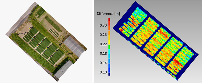 Agriculture. In figure 5, georeferenced images were taken during a flight over a wheat field. The same process was repeated after two weeks. The difference of the respective point clouds, which were determined using the software Photoscan by the company Agisoft, reveals the plant growth at an interval of two weeks. These results show that the determination of plant growth rates, which usually result from time-consuming field work, can be done easily and with high resolution using MAVs. With the use of a direct georeferencing system, this process becomes even more efficient because the deployment of ground control points can be omitted.