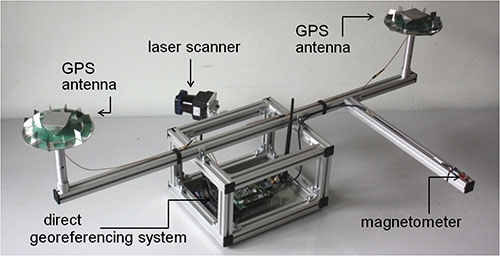 Portable laser scanning system. The small and lightweight design of the direct georeferencing system offers several other opportunities for various applications. One example is the use of the direct georeferencing system in combination with a small, lightweight and low-cost laser scanner.