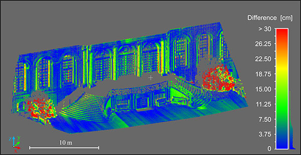 Figure 7 shows differences between a directly georeferenced point cloud, measured by the portable laser scanning system, and a terrestrial laser scanning point cloud, which was indirectly georeferenced using ground control points. Although there are some systematic errors visible, the differences are mostly less than 7.5 cm. The larger differences in the foreground (red) are a result of growing vegetation in the period between both scans. The systematic errors result from the system calibration between the laser scanner and the direct georeferencing system. We are working to improve these calibration methods.