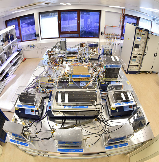 The cleanroom environment of the Galileo Payload Laboratory contains the same atomic clocks flown aboard Galileo satellites with the rest of its navigation payload, used to replicate any performance anomalies identified in orbit and make early tests of Galileo Second Generation design improvements.