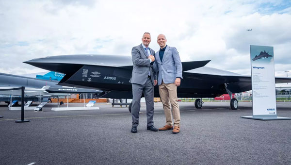 Airbus and Helsing CEOs with Wingman model.(Photo: Airbus)
