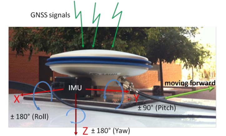 Integration of GNSS antenna of rover receiver and IMU in a platform over the roof of the vehicle.