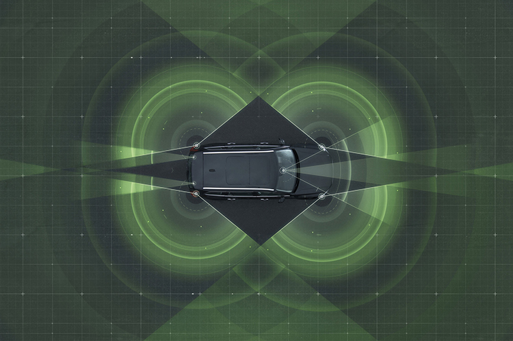 Surround radars. Four radars behind the front and rear bumpers (one on each corner of the car) are able to locate objects in all directions. By sweeping both left and right, transmitting waves that bounce off signs, poles, and tunnels, they monitor a full 360-degree around the car.