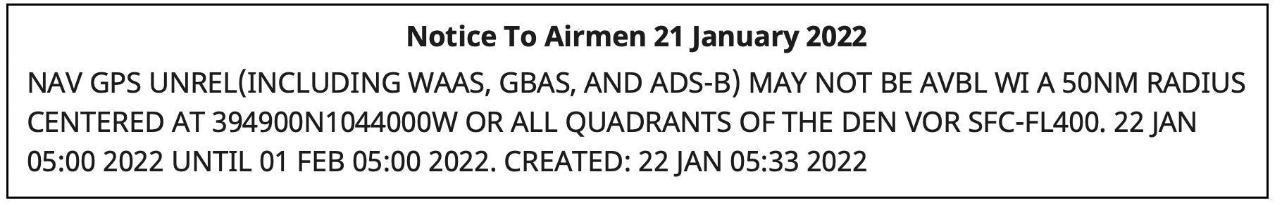 On that day, Air Traffic Control issued a notice advising pilots of problems with GPS reception spanning about 8,000 square miles in the Denver area.