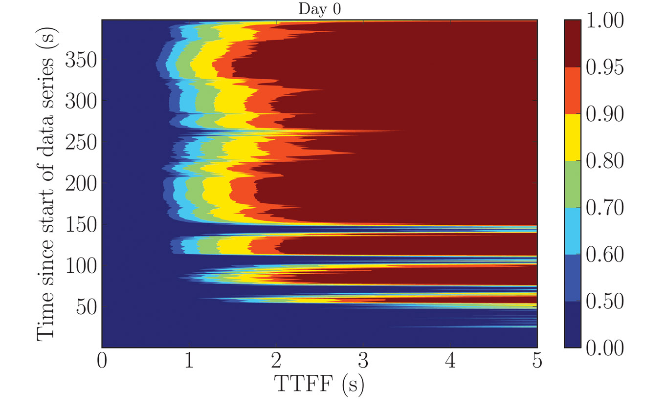 To illustrate this method, we consider a model of an assisted-GPS receiver combined with experimental measurements of the GPS L1 C/A signal taken indoors. The results are presented in Figure 1, where the probability of the TTFF (horizontal axis) is plotted as a function of the time after the beginning of the data series at which the acquisition process started (vertical axis), calculated using a 400-second GPS data series measured indoors. The strength of our approach is that we can quickly calculate the TTFF probability for any given confidence level and it is quite general so that it can be extended to other types of receivers.