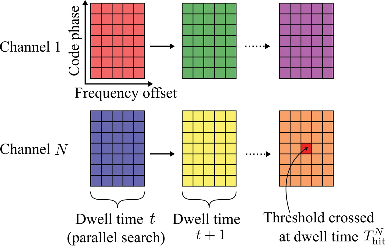 In general, signal detection is performed by correlating incoming signals with a local satellite signal replica for every combination of parameters in the search space. The correlated signal is then integrated and a “hit” is declared if the integrated value crosses a predetermined threshold. The time required to test for the presence of a satellite signal for each combination of parameters is called the dwell time. We suppose here that this is approximately equal to the integration time.