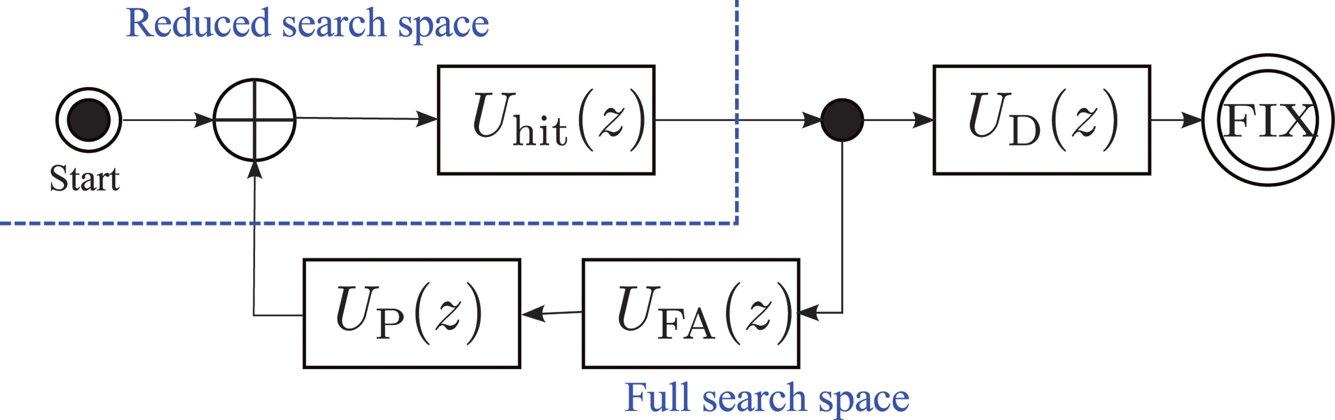 The last step before obtaining an expression for the TTFF distribution is to combine the two stages of the assisted acquisition. The total acquisition time is the sum of the time to first hit in the full-space stage and the time to the correct detection of M satellites in the reduced-space stage. This sum is easily calculated using generating functions, with the corresponding flow-graph represented in Figure 3.