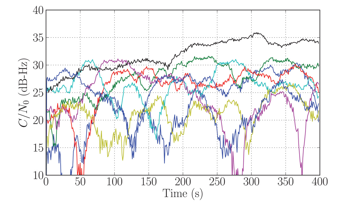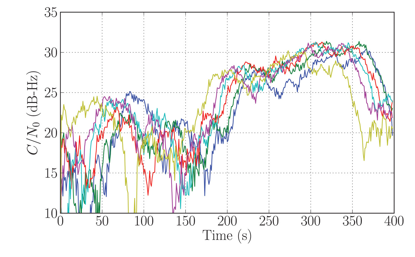 The signal carrier-to-noise density ratio (C/N0) was recorded for 400 seconds, starting every day at the same sidereal time, for six consecutive days.