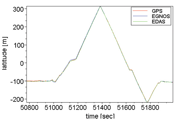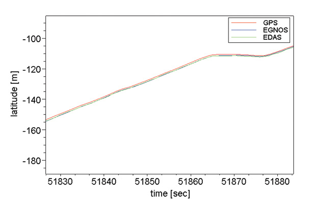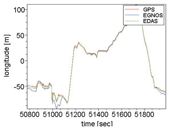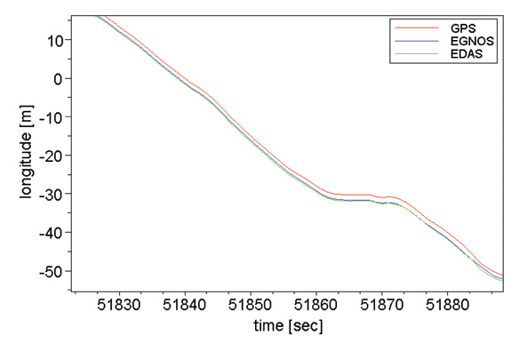 Figures 8 to 11 show the longitude and the latitude of the different solutions. Two plots of each coordinate were used: the first one shows the coordinates during the whole measurement, and the second one emphasizes the time interval between second 51820 and second 51890. Here, the EGNOS and EDAS/SiSNeT solution are very similar. In some other parts of the measurement, the EDAS/SiSNeT solution is closer to the GPS-only solution.