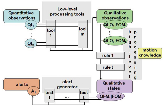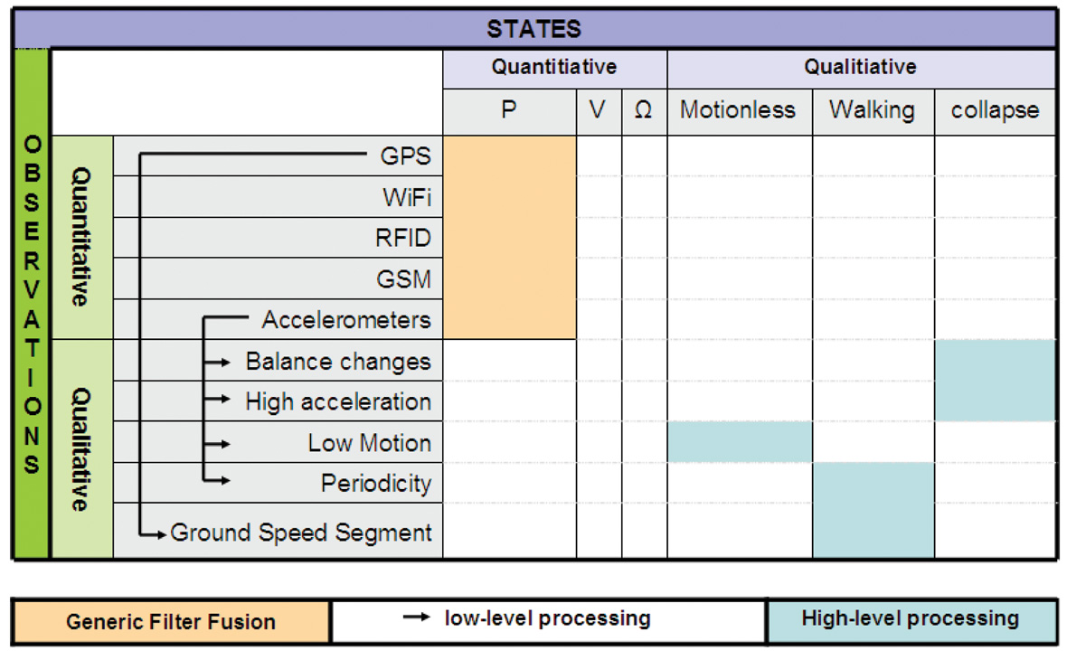High-Level Processing: from qualitative observations to qualitative states. So far, one may think that the navigation requirements are already fulfilled: a person can be localized, in a seamless indoor and outdoor way, and thus can be feasibly reached if needed. But IEGLO seeks to enhance this navigation concept to provide contextual information about the person, and eventually activate automatic warning messages in case of undesired motion behavior. To do this, the qualitative navigation concept has been developed by analogy of the quantitative navigation: [qualitative or quantitative] observations are used to estimate [qualitative or quantitative] states.