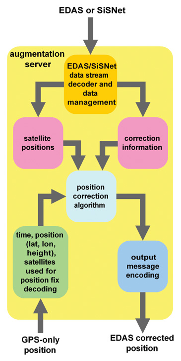 The augmentation server accesses EGNOS information from EDAS or SiSNeT, decodes the data, and stores it in a database. As a backup solution, if EDAS cannot be accessed, the augmentation server can also interface to an EGNOS receiver to decode the EGNOS signal in space. The augmentation server is provided with ephemeris and ionospheric information from EDAS/SiSNeT. The GPS position is received from the correction requesting unit together with its time and used satellites. It is corrected at the augmentation server and retransmitted back to the requesting unit.