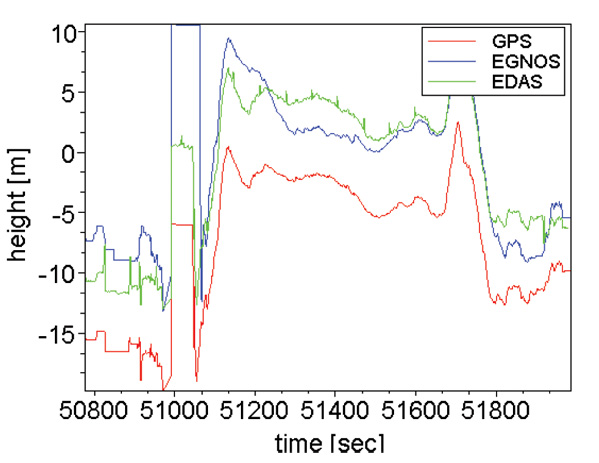Figure 7 demonstrates the good performance of the augmentation server concept regarding the height solution. The ionospheric delay, which can be corrected with the EGNOS signal, particularly influences the height component of the position. Thus, the potential of the EDAS/SiSNeT-based correction is seen in the height plot.