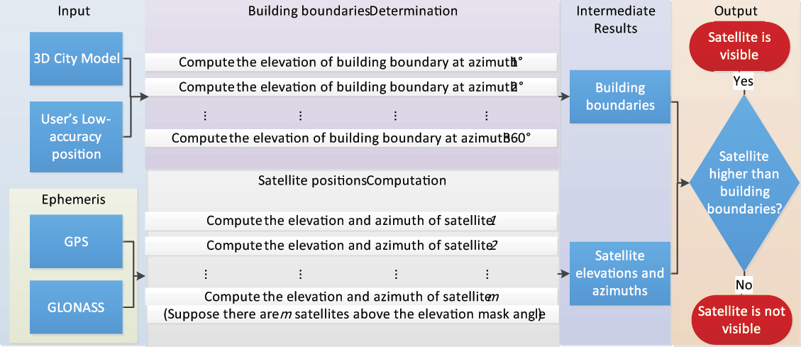 Next, each satellite elevation is compared with the building boundary elevation at the same azimuth. The satellite is predicted to be visible if it is above the building boundary. If the satellite is just within the building boundary, a potentially diffracted signal can be predicted. However, this feature was not included in the preliminary shadow-matching algorithm described here. A software toolkit for determining satellite visibility was developed in C++.