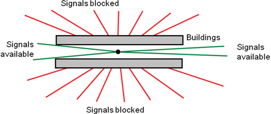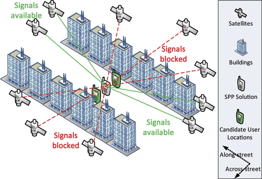 Using GLONASS in addition to GPS considerably enhances direct signal availability, and the ongoing deployment of Galileo and Compass will enhance it further. However, an urban canyon affects the geometry of the available GNSS signals as well as their number. Signals with lines of sight going across the street are much more likely to be blocked by buildings than signals with lines of sight going along the street (see Figure 1). As a result, the signal geometry, and hence the positioning accuracy, will be much better along the direction of the street than across the street. For example, for a building-height-to-street-width ratio of three and direct signals from four GNSS constellations, the cross-street position uncertainty can exceed 20 meters, while the along-street uncertainty is within 5 meters.