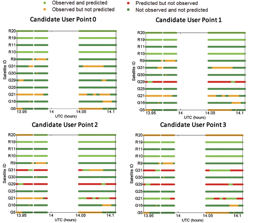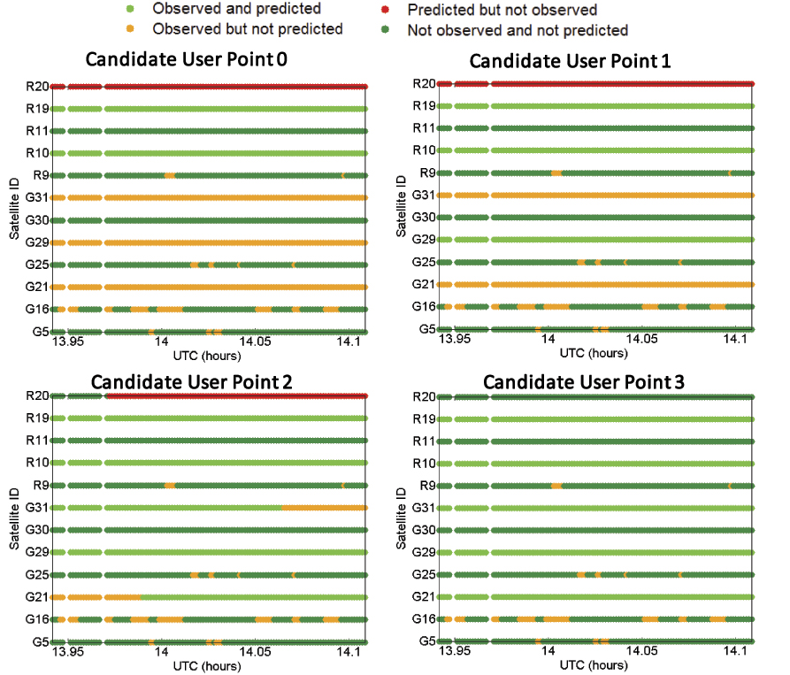 In Figure 9, the green and blue dots indicate an agreement between prediction and observation for the candidate user position, while the orange and red colors represent their disagreement. Thus, a larger number of cases of green and blue indicate a better match between the candidate user location and the observations. Therefore, such a candidate is more likely to be close to the receiver’s true position.