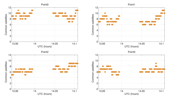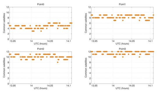 It is clear from Figure 11 that among four possible user positions, point 3 is the one with the highest agreement score with the observations from receiver A. As shown in the right-bottom graph, for about half the epochs, visibility predictions for all 12 satellites above the masking angle match the real observations.