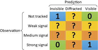 NLOS reflected and diffracted signals are weaker than directly-received signals, so the shadow-matching algorithm could be modified such that only signals received above a certain signal-to-noise threshold are classified as observed. However, this would introduce a new problem: signals received via a direct LOS path but attenuated by a person’s body would be classified as not observed, even though they would be predicted to be visible at the correct location. The same problem would occur where the LOS coincides with a direction in which the antenna is weak. Consequently, to get the best performance from shadow matching, several different categories of observed signal should be considered in the scoring matrix.