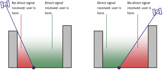 The principle of shadow matching is simple. Due to obstruction by buildings in urban canyons, signals from many GNSS satellites will be receivable in some parts of a street, but not others. Where each direct signal is receivable can be predicted using a 3D city model. Consequently, by determining whether a direct signal is being received from a given satellite, the user can localize their position to within one of two areas of the street. Figure 2 illustrates this. By considering other satellites, the position solution may be refined further, producing a much more accurate cross-street position solution than available from conventional GNSS positioning in this environment. Thus the observed signal shadowing is matched with the predicted shadowing to determine position.