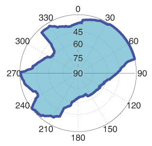 Satellite Visibility Prediction. At each candidate position, the two-step building boundary method predicts satellite visibility from the 3D city model. First, a building boundary from a GNSS user’s perspective is determined for each azimuth (from 0 to 360°) as a series of elevation angles. The results from this step show where the building boundaries are located within an azimuth-elevation sky plot. Figure 3 shows an example of a building boundary computed from a possible user location. Once the building boundary has been computed, it may be stored and reused.