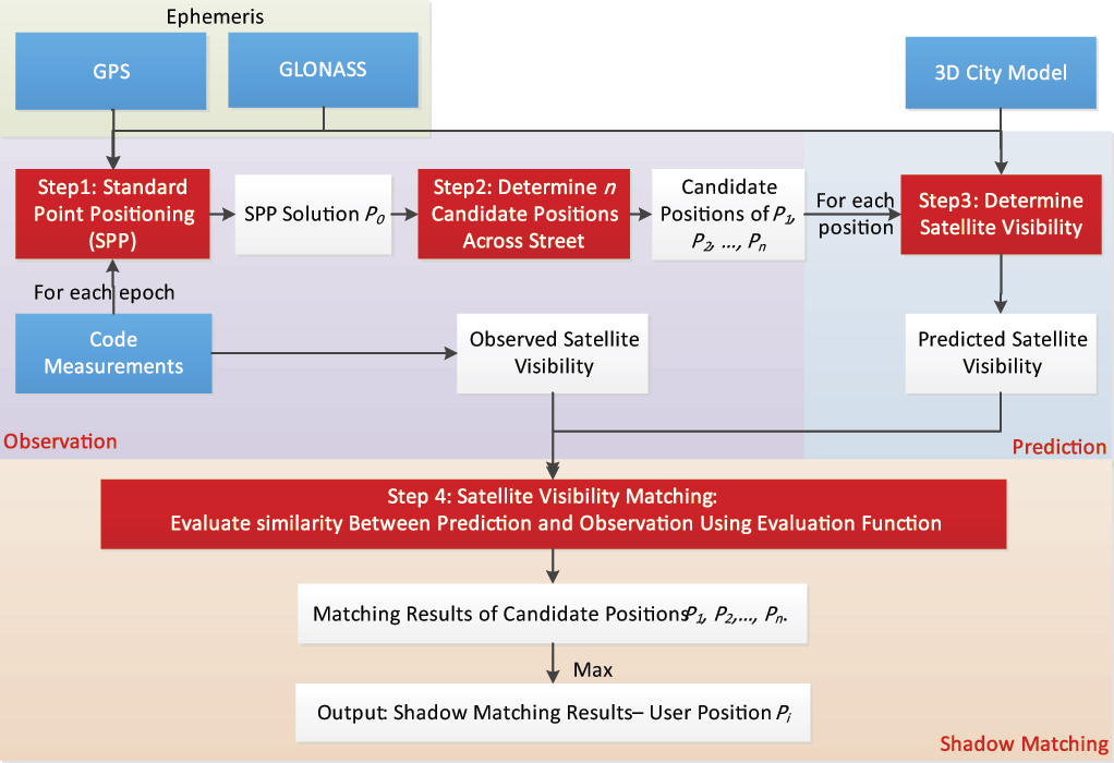 - Evaluate the similarity between predicted and observed satellite visibility at each position. The candidate position with the best match is deemed to be the shadow-matching solution. This process can be conducted epoch by epoch, so the GNSS user can be either static or dynamic.