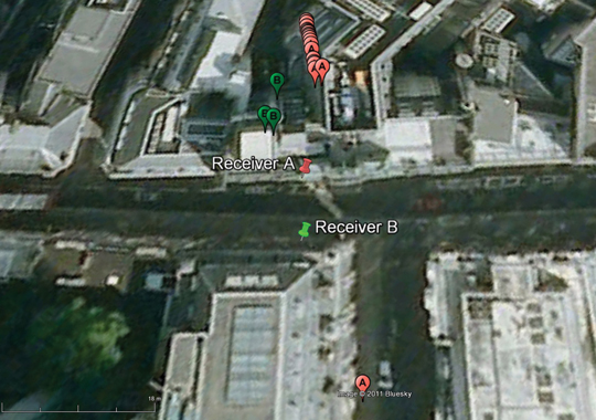 Satellite visibility was predicted individually for each of the four positions. Then each was compared with the real data observed from the two GNSS receivers. Figure 8 shows part of the architectural city model of London used to predict the satellite visibility.