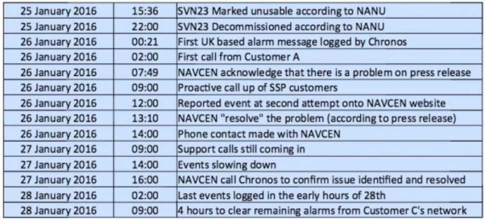A week after the eye blinks, Chronos Technology released a white paper describing the ensuing fallout for its clients, who are timing equipment users in more than 50 countries around the world. Table 1 from the white paper reports the experience of a few during the event. One company registered nearly 2,500 alarms from its timing equipment during the outage.